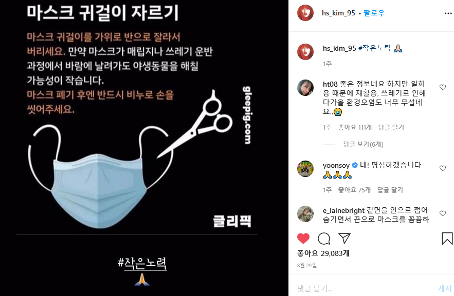 얼마전부터 여러 카페와 게시판에 한장의 사진이 떠돌아 다녔습니다. 바로 마스크를 잘라서 버리라는 안내 사진이었는데요, 급기야는 유명인이 인스타에도 올라가게 되었습니다.