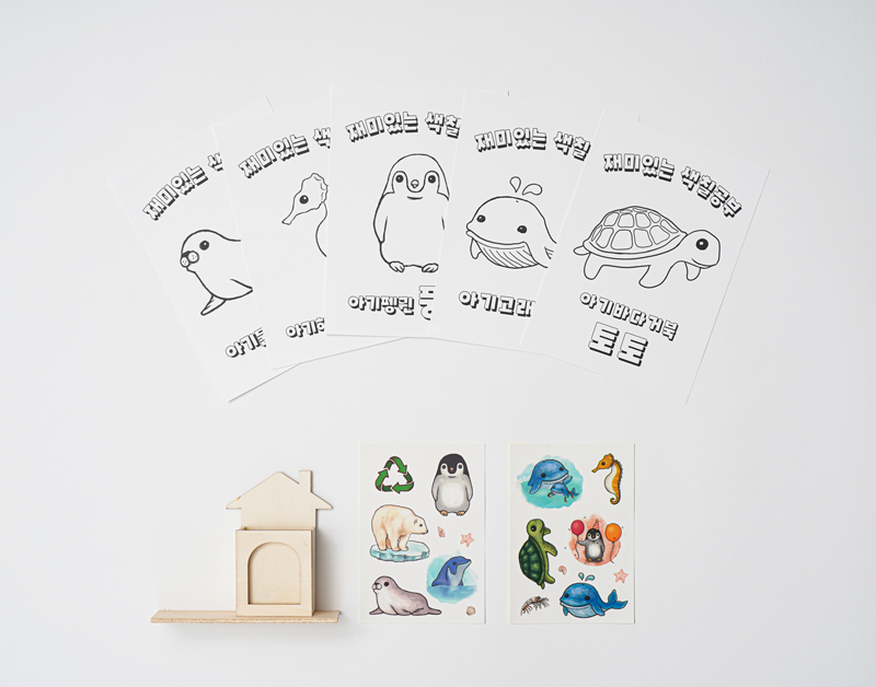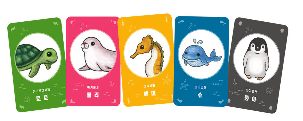 아기 바다거북, 물개, 해마, 고래, 펭귄이 캐릭터 카드 5장이 매우 깜찍합니다.