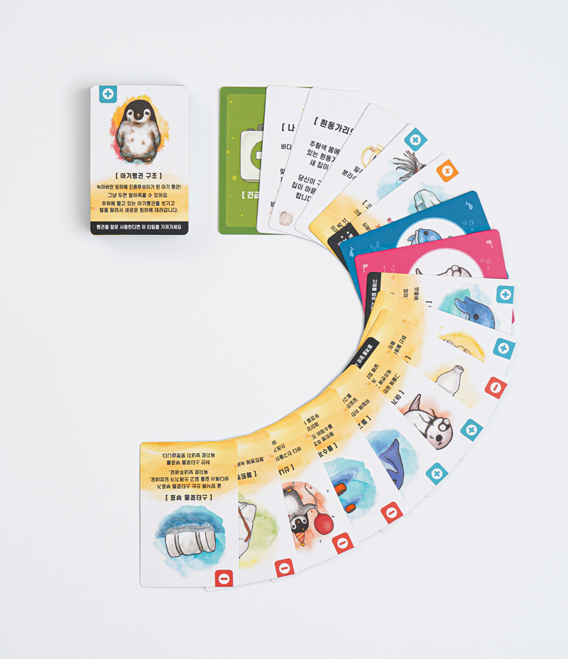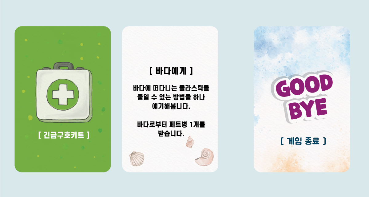 위기에 처한 바다동물을 구하면 행운이 와요~ 만약 내 캐릭터와 같은 동물이 나온다면 그 카드를 가져와야 해요! 앞으로 [+] 타일에 도착할 때마다 추가로 페트병 1개를 더 받습니다.