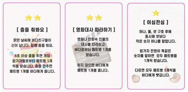 게임 참가자는 바다 캐릭터가 되어 바다 속 페트병을 모으고, 모험 도중에 만난 위기에 처한 바다 동물도 구조합니다. 바다에서 페트병을 얻거나 잃거나 아주 간단한 규칙으로 재미있는 시간을 보내세요~